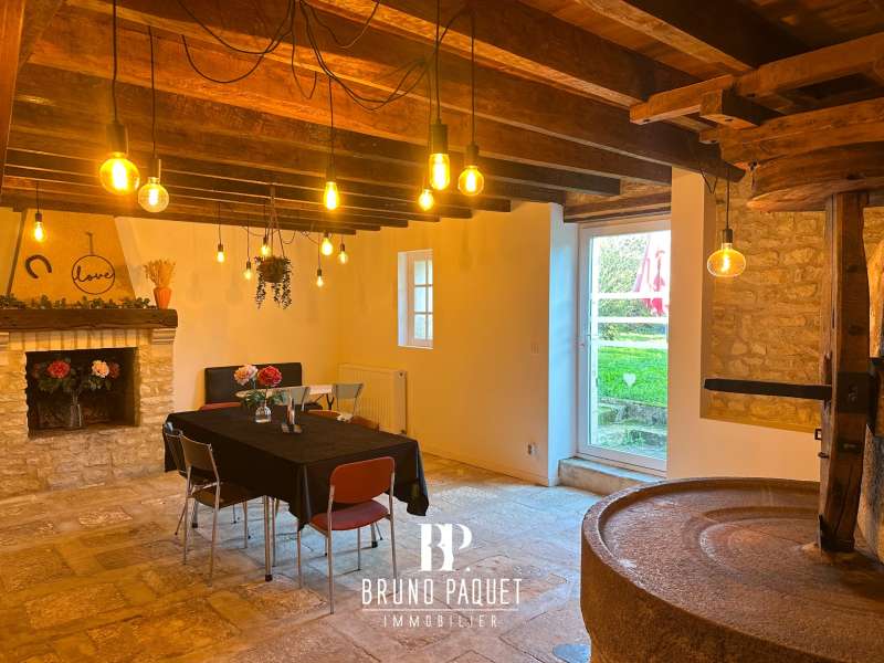 Grande salle à manger avec ancien pressoir en pierre