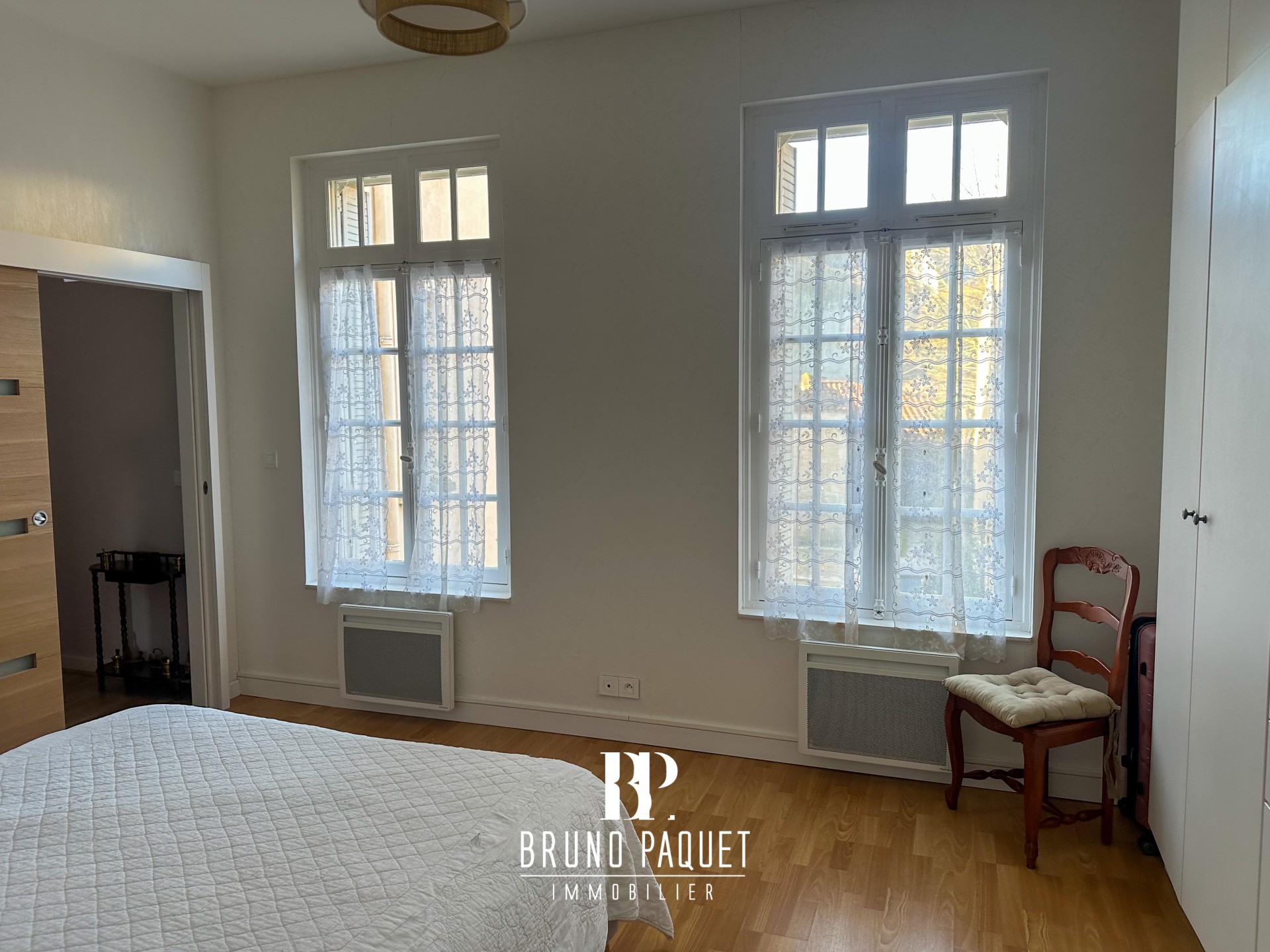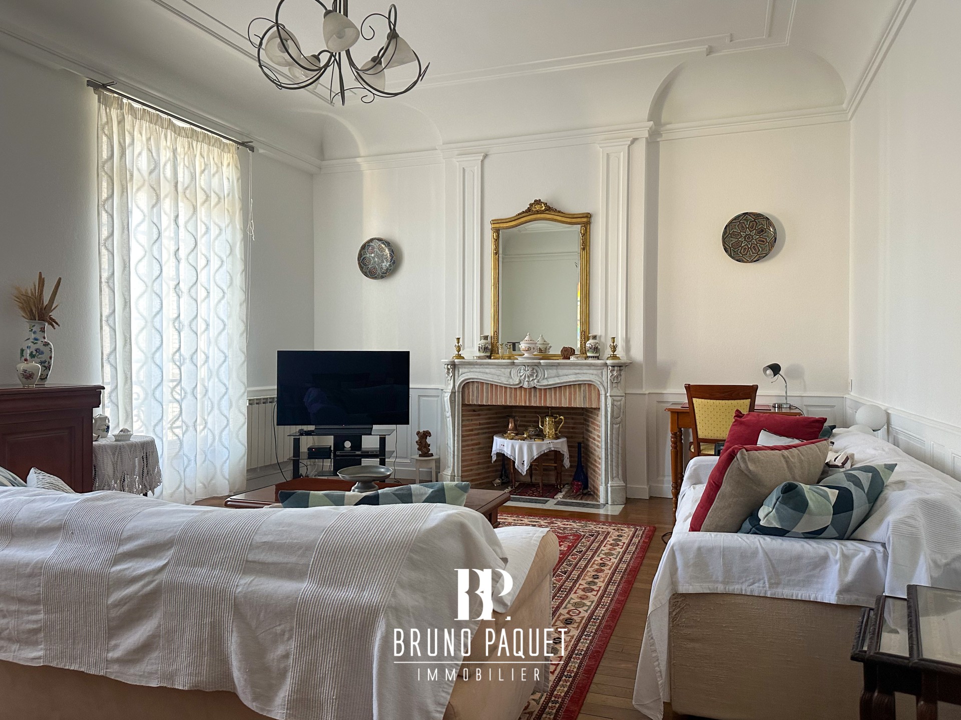 Il offre une spacieuse pièce de vie lumineuse au charme de l’ancien (parquet, belle hauteur sous plafond), une cuisine séparée, 2 chambres, un bureau, 2 salles d’eau et un WC indépendant.